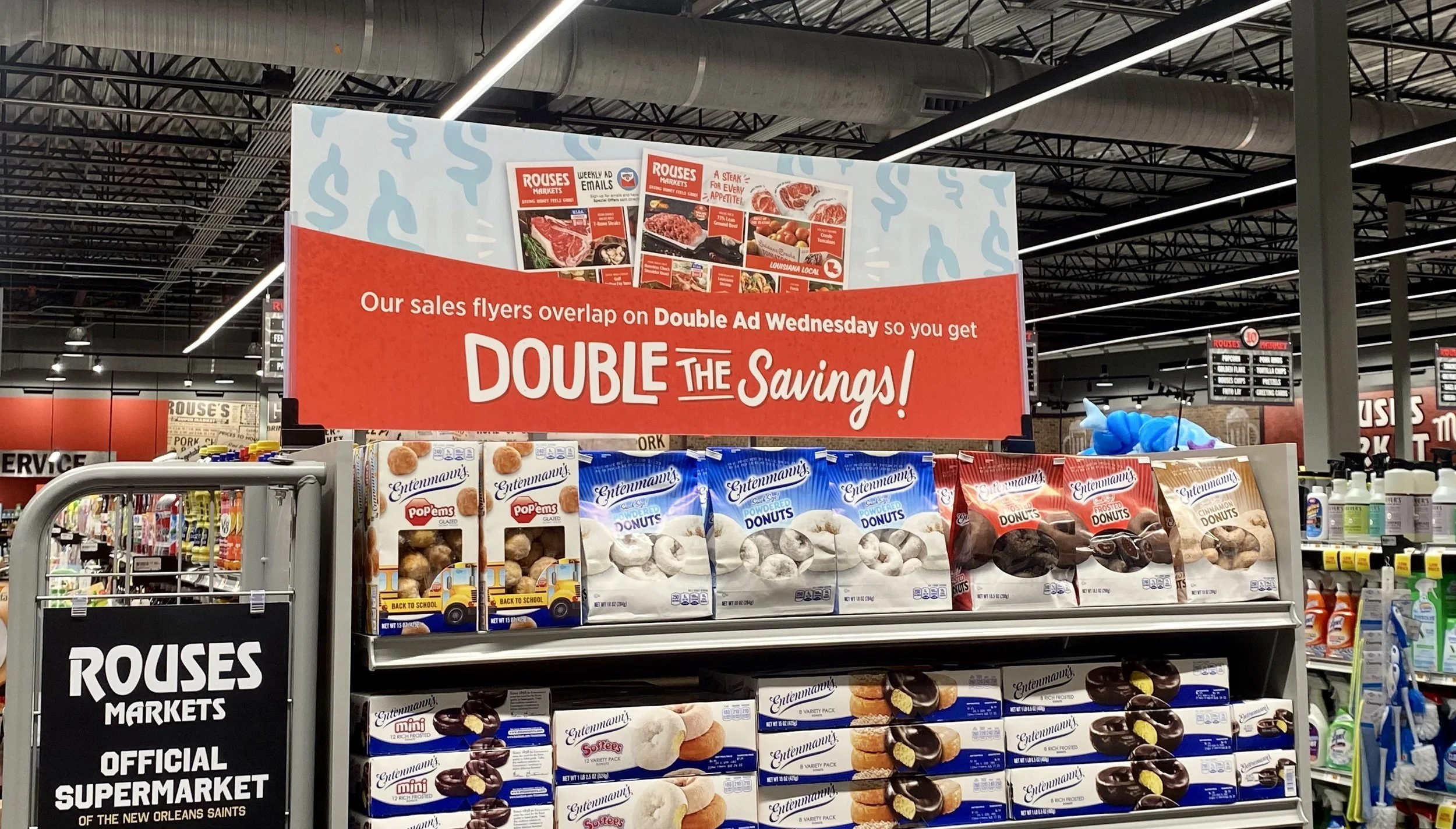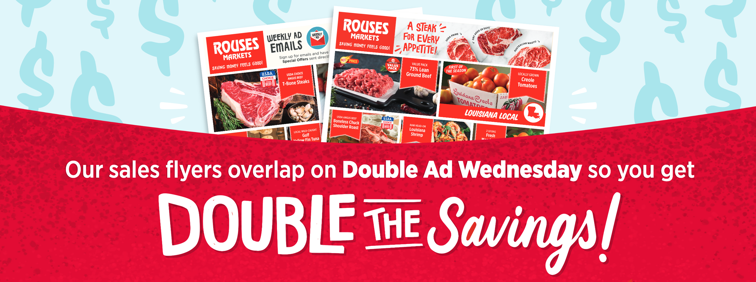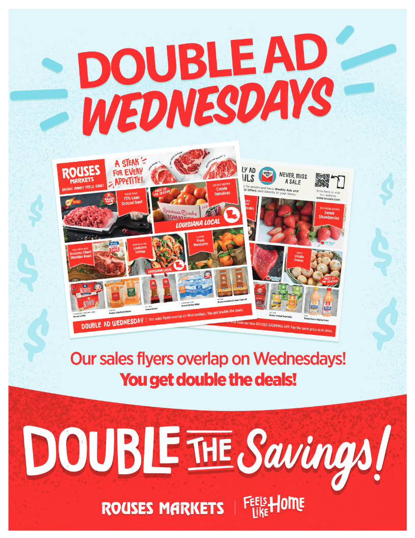 I created the visual identity for the Double Ad Wednesday campaign. This campaign highlights and informs about the overlap between Rouses sales flyers, offering customers double the savings on Wednesdays.